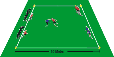 2 Tore mit Torhütern in einem Abstand von 15 m auf den Grundlinien.